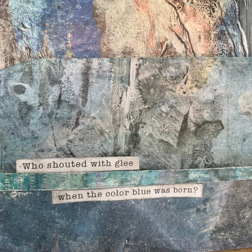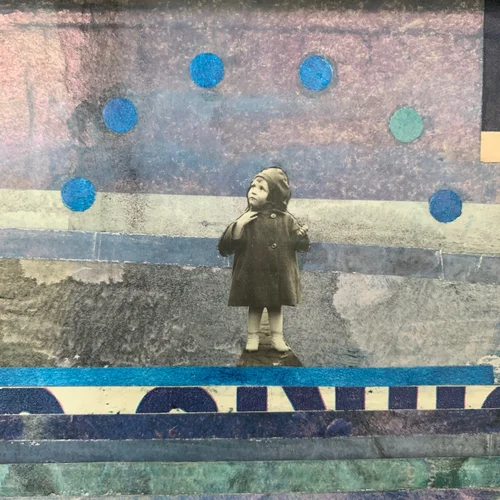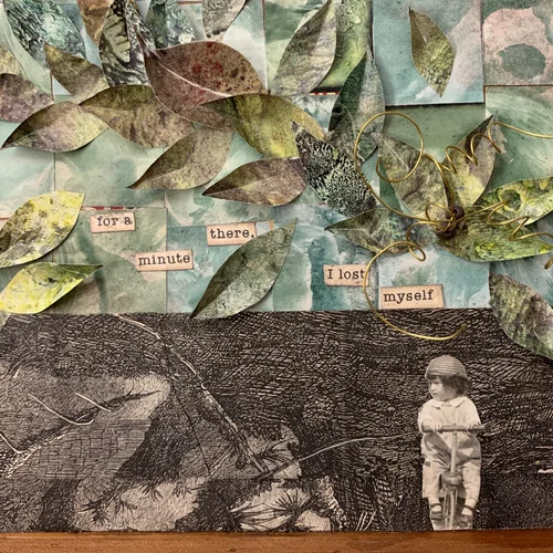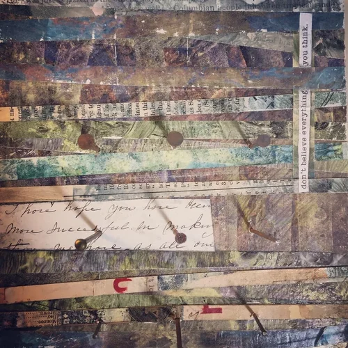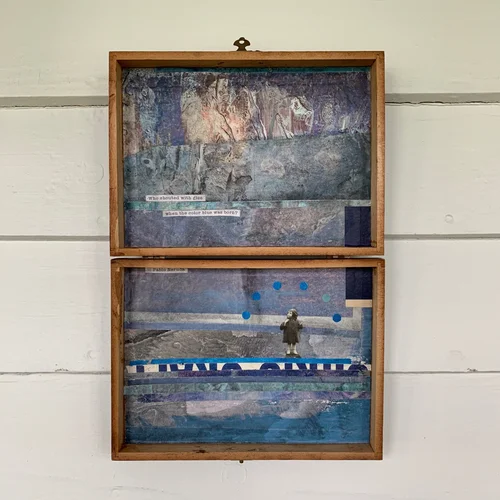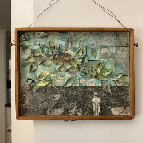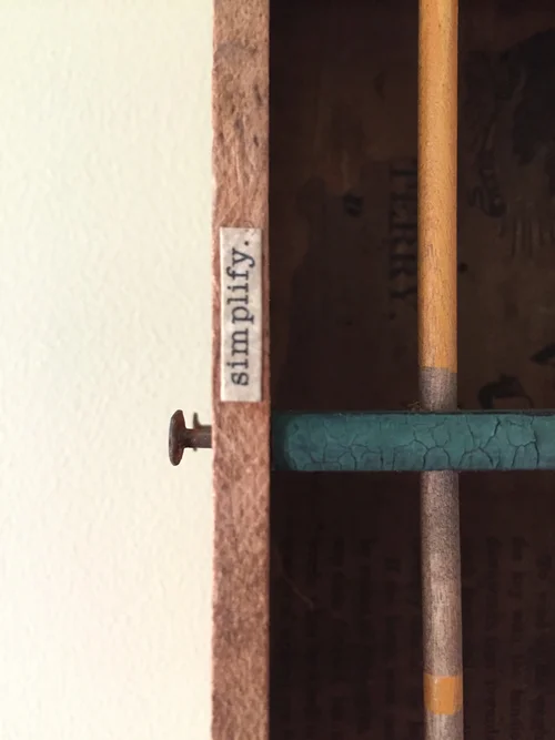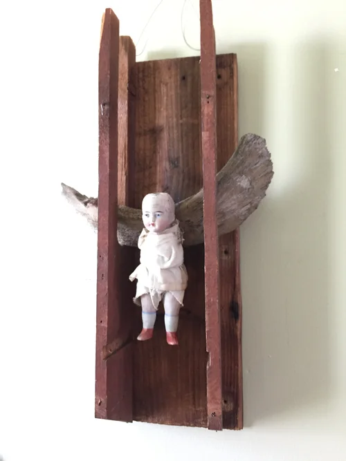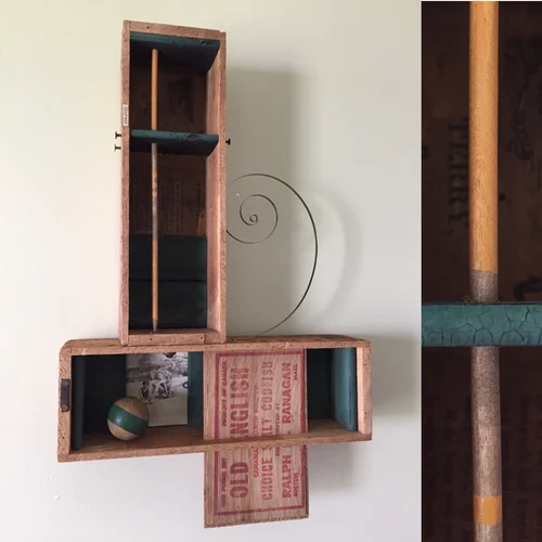 Wood boxes, vintage family photo, clock spring, green shutter louvers, child’s toy croquet ball.