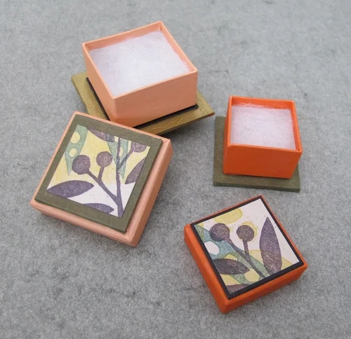 I created molds of some of my mom’s original wood blocks used for printing clothing. Beads are cast with a resin-infused plaster and then hand colored.