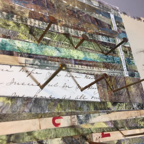 Wood box, green shutter louvers, clock spring, rusty nails, bone.