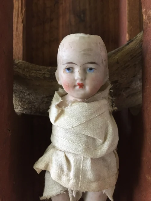Old box, lathe, wood scraps, vintage figure, metal, pebble.